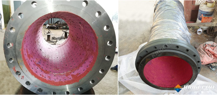 1. 粘貼式:粘貼式是用粘膠將耐磨陶瓷張貼在設備內表面。這種方法裝置簡潔,本錢較低,格外合適現場大面積施工,節省維修時刻。可是因為粘膠主要是有機成分,不耐高溫(較高耐溫達150℃),且易老化。因而這種張貼方法只適用于常溫下的工作環境。